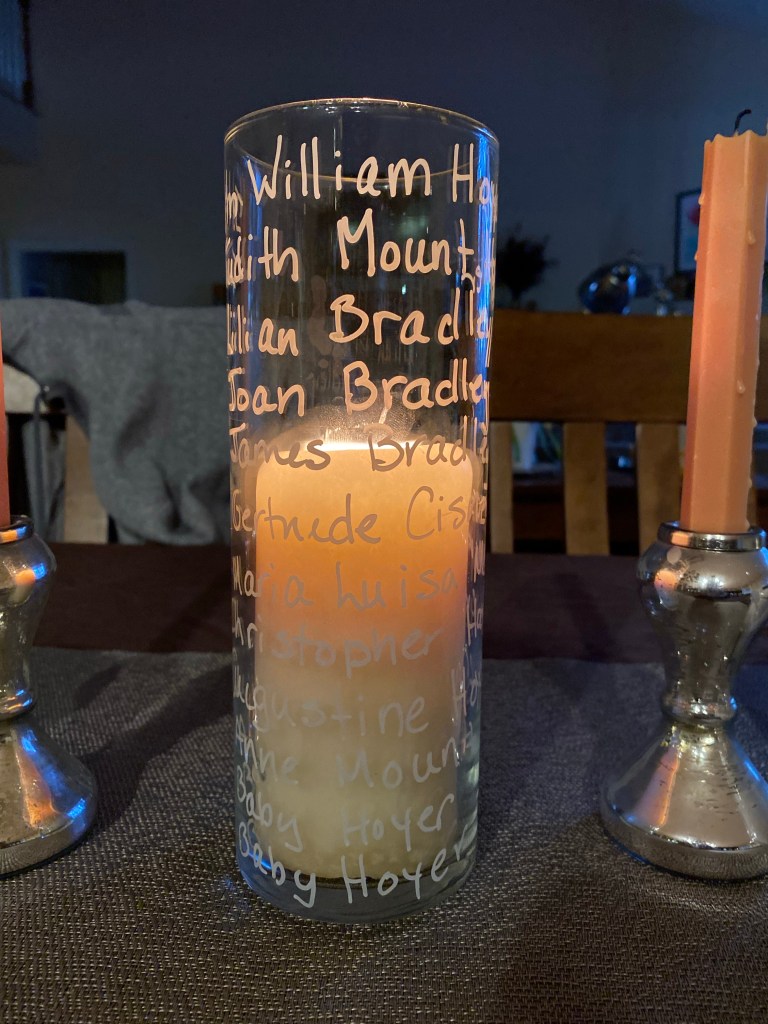 Because I choose to believe my son is in Purgatory to prepare himself for Heaven, I decided to write his name and the names of our deceased family members on a glass vase and place a candle inside. On November 2, All Souls Day, I lit the candle and prayed for my son and the other family members. My plan was to light the candle on Fridays and Sundays during November, however, I’ve been sick for several weeks. Since today is Friday, I’ll be lighting the candle.