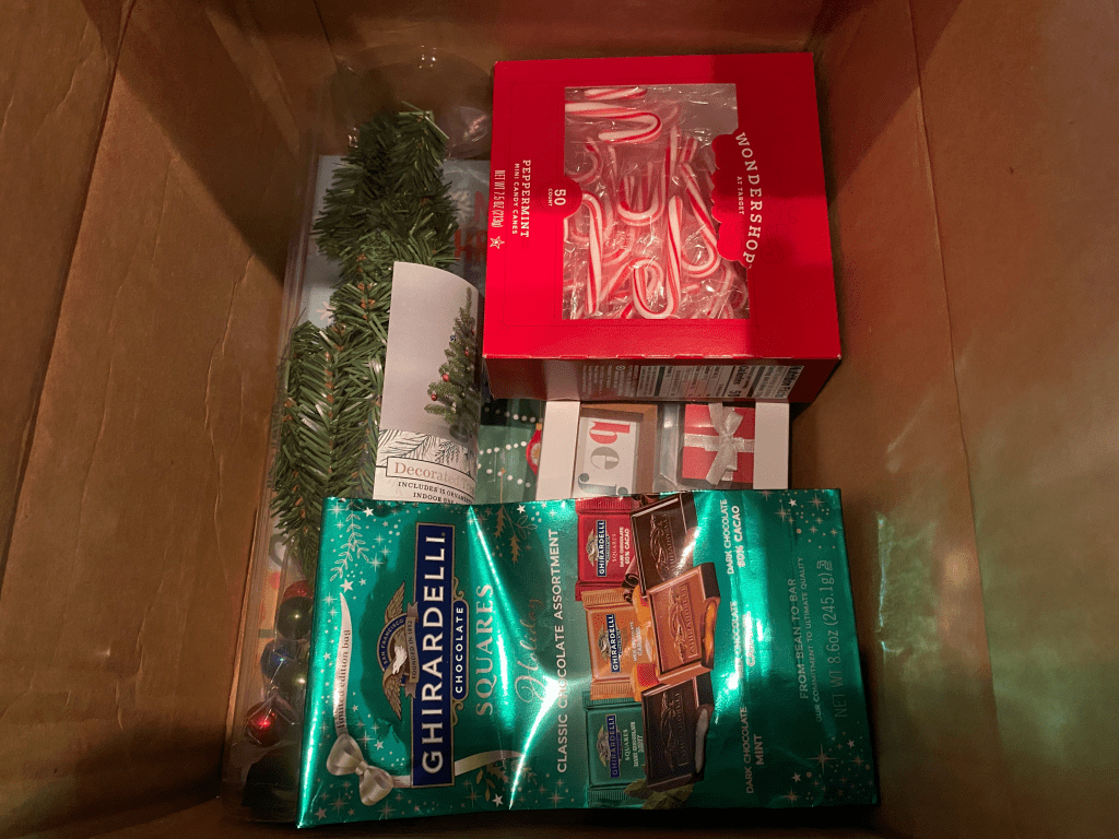 Welcome to my new tradition for my children – the Christmas box. Two of my sons are away at college and grad school. It will be the second year they aren’t with us during Advent. I decided to send them some Christmas cheer to have in their rooms until they’re home with us at Christmastime.