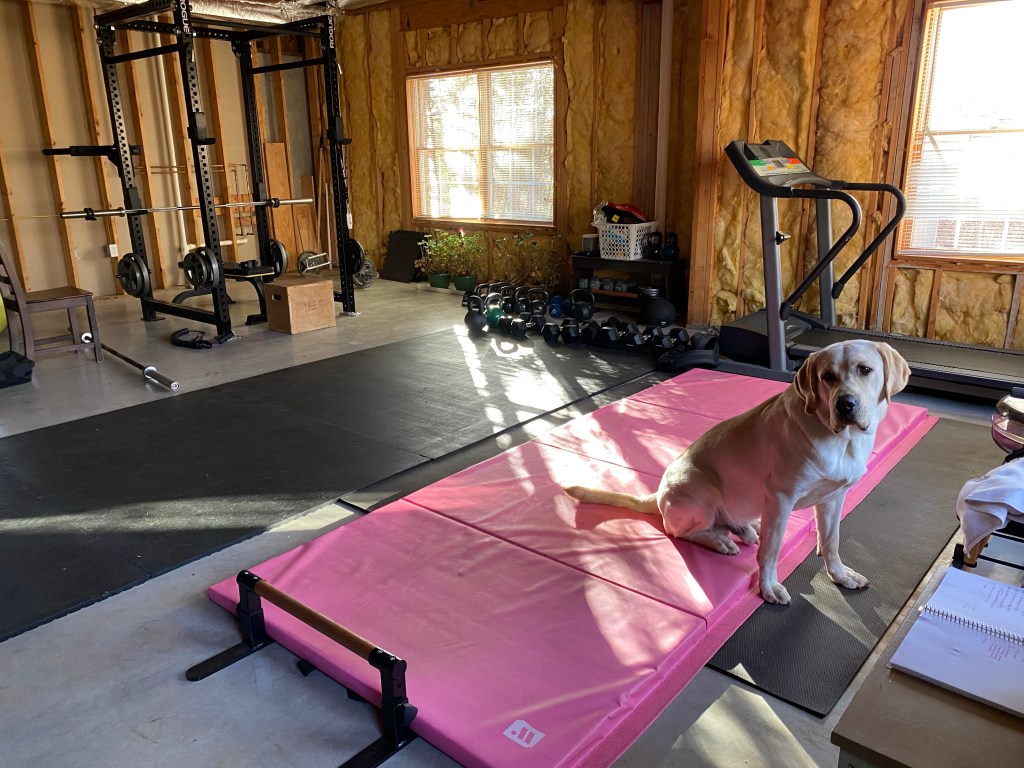 Welcome to our revamped gym! We have a few items to finish however I like the new layout. The power rack used to be where the pink mats were. In its new spot, two people can use the rack and we can leave the dip bar in place.