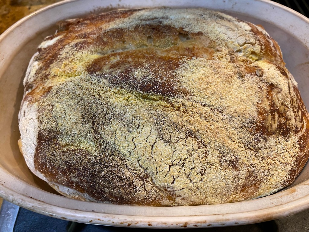 Two hours before baking the bread, turn the dough onto a floured surface and cover with the plastic wrap. Let the dough rest for 15 minutes. Dust a cotton towel with cornmeal. Place the dough on the towel and cover with a cotton towel.