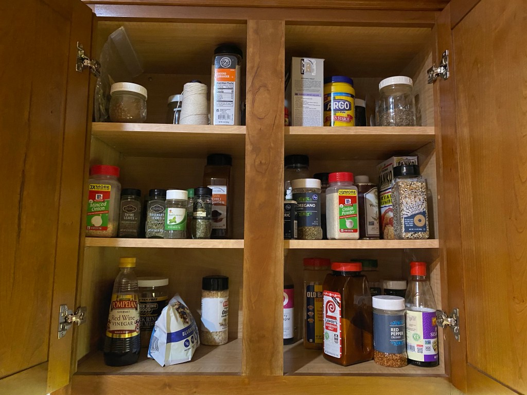 A friend of mine, Darla of Heartwork Organizing, is doing a monthly organizing challenge once again. If you join her Facebook group or visit her site, you can see the monthly schedule. This month is the Kitchen and Pantry. Today, I decided to tackle my spice cabinet and the corner cabinet along with our small pantry. While it’s currently hard to see the spices (which I will remedy), I did inventory and refill the bottles. I also combined a few bottles and set the empty ones aside for repurposing. I need to make a spot for storing them.