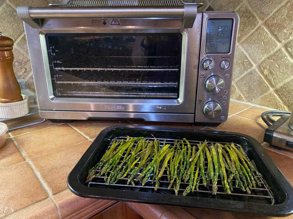 Before Christmas, I bought 2 bunches of asparagus on sale. I still had a bunch left in the fridge looking a little tired. I used some in a quiche earlier this week. Today, I air-fried the rest in our smaller oven. Since our electric bill was twice as much this month due to Christmas lights, electric heat, and lots of Christmas baking, I’m retraining myself to use this countertop oven as much as possible. My husband says it uses half the electricity of our wall oven. We bought the Breville about a year ago; it’s been a good purchase!