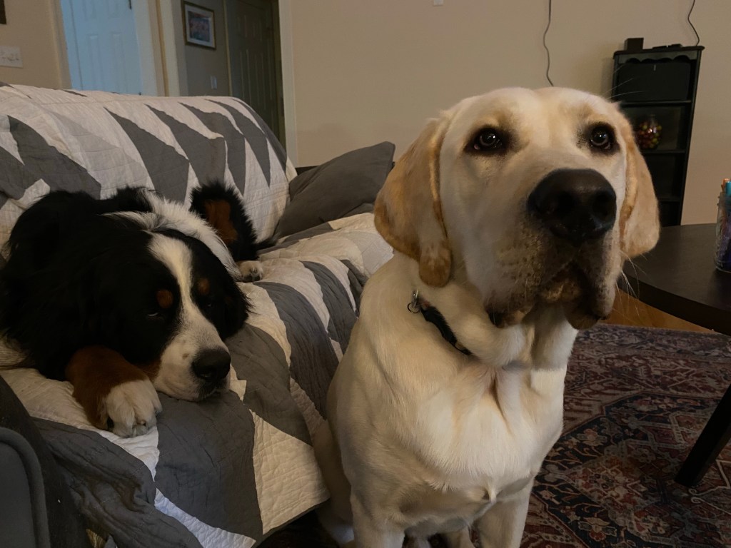He’s a serious guy next to our Bernese Mountain Dog. He just looks at you while Tobey’s next him with his tongue hanging out and a big doggie smile on his face.