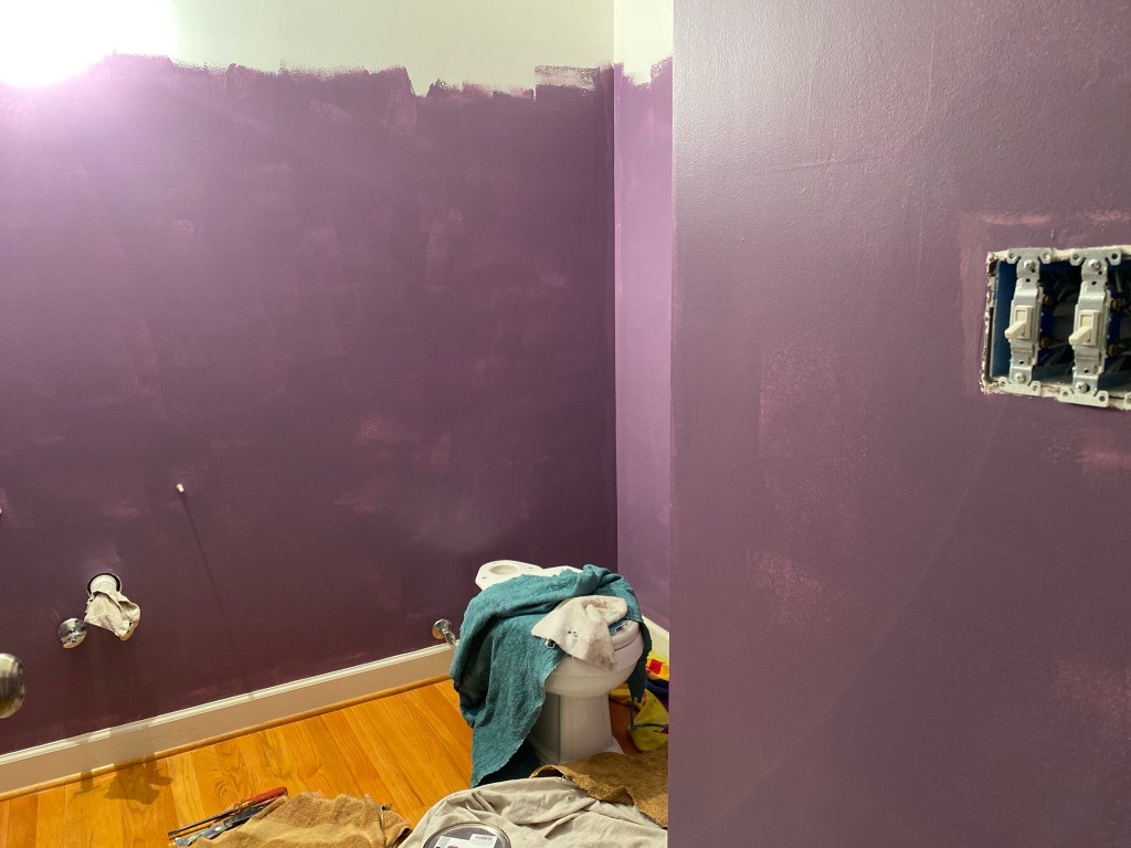 I decided to use the dark purple I used in my youngest son’s bedroom. Since we were painting walls that previously had wallpaper on them we did 2 coats of oil based primer to lock in any remaining glue residue.