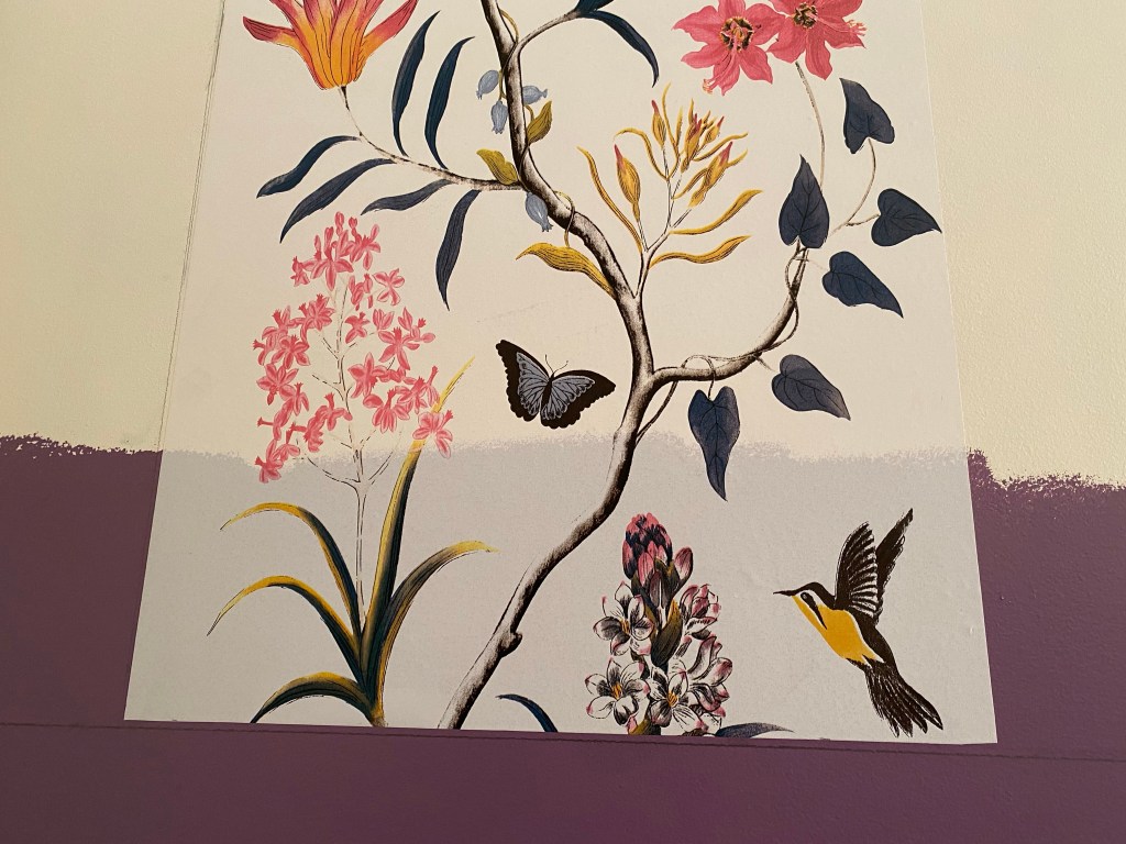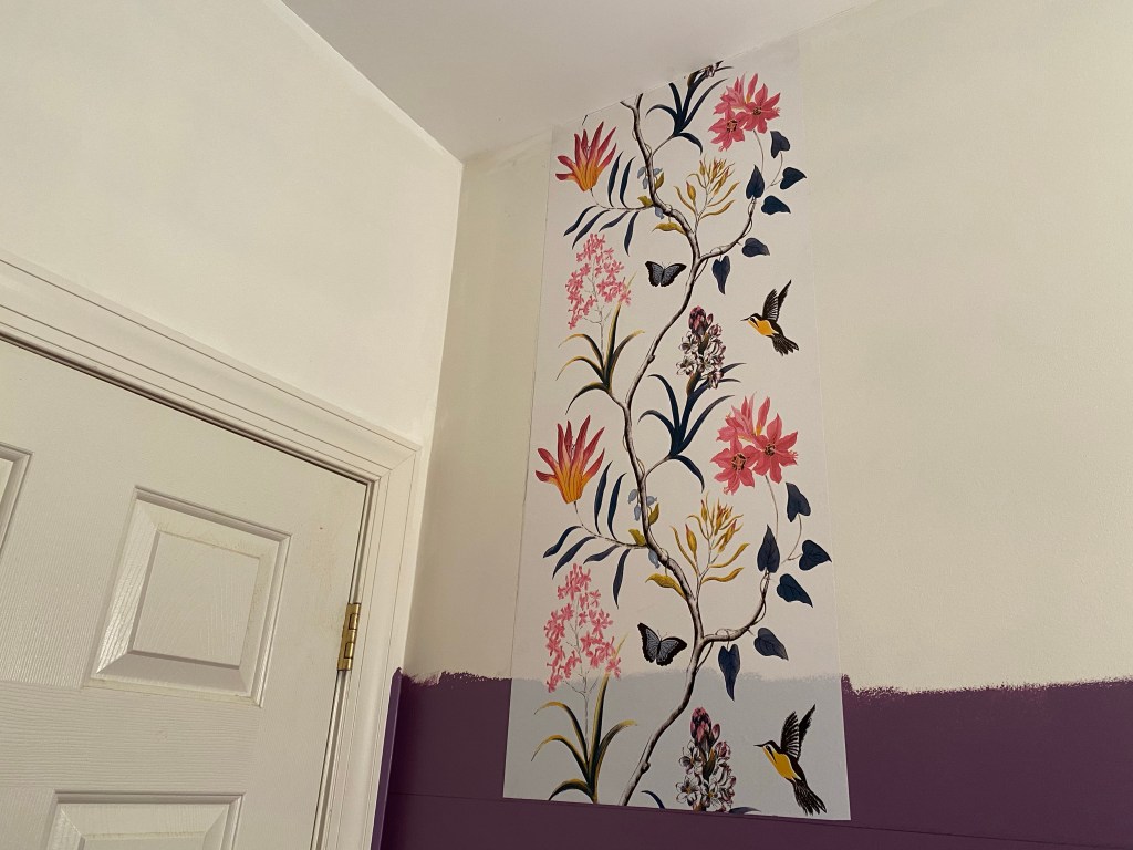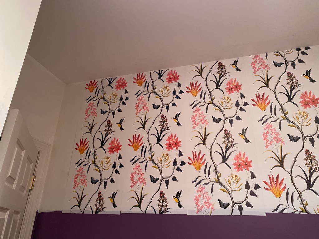 Unfortunately the wallpaper is somewhat transparent. When we painted the purple, we wanted to make sure we went under the top moulding. That ended up being too far up. My husband fixed the issue and now he’s slowly working his way around the room with the wallpaper. He’s finding it extremely frustrating to put up without tearing.