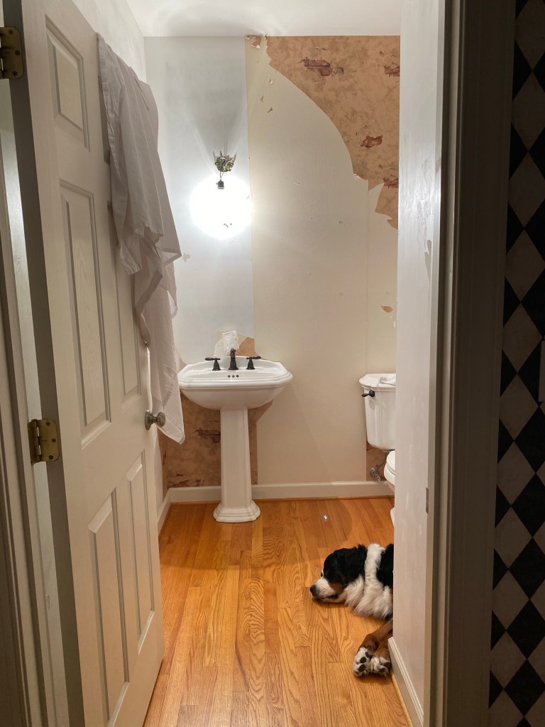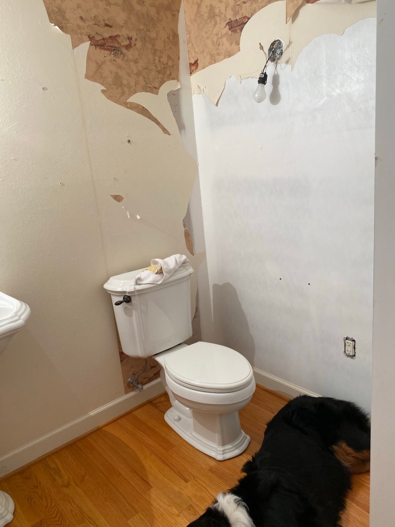 The wallpaper pattern in here was a mud wall with exposed bricks. As patterns go, it wasn’t the worst, but difficult to look at in a small bathroom. Once we discovered the wallpaper steamer, it was fairly easy, though a bit messy to remove the wallpaper.