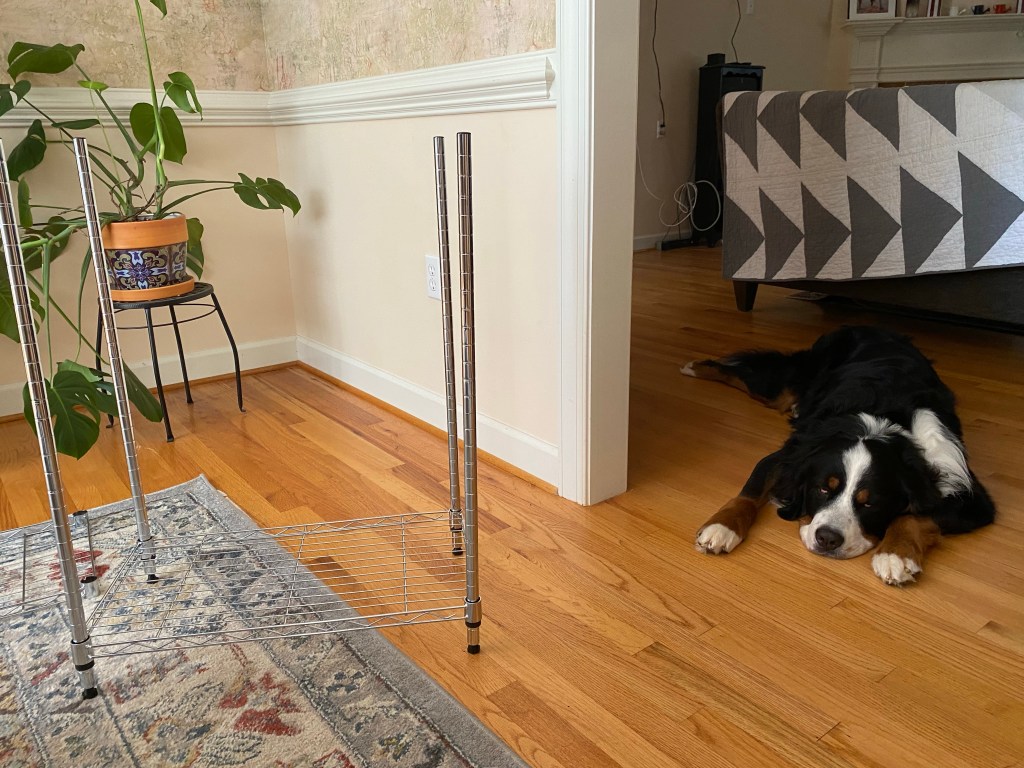 I searched through my photos to find a good before-shot of our breakfast room. I remember taking a bunch of photos of the different wallpapers in our home, but I can’t find them! So, I’m using a photo that just barely shows the watercolor style of wallpaper that was on the walls of the breakfast room along with an amazing cute Berner.