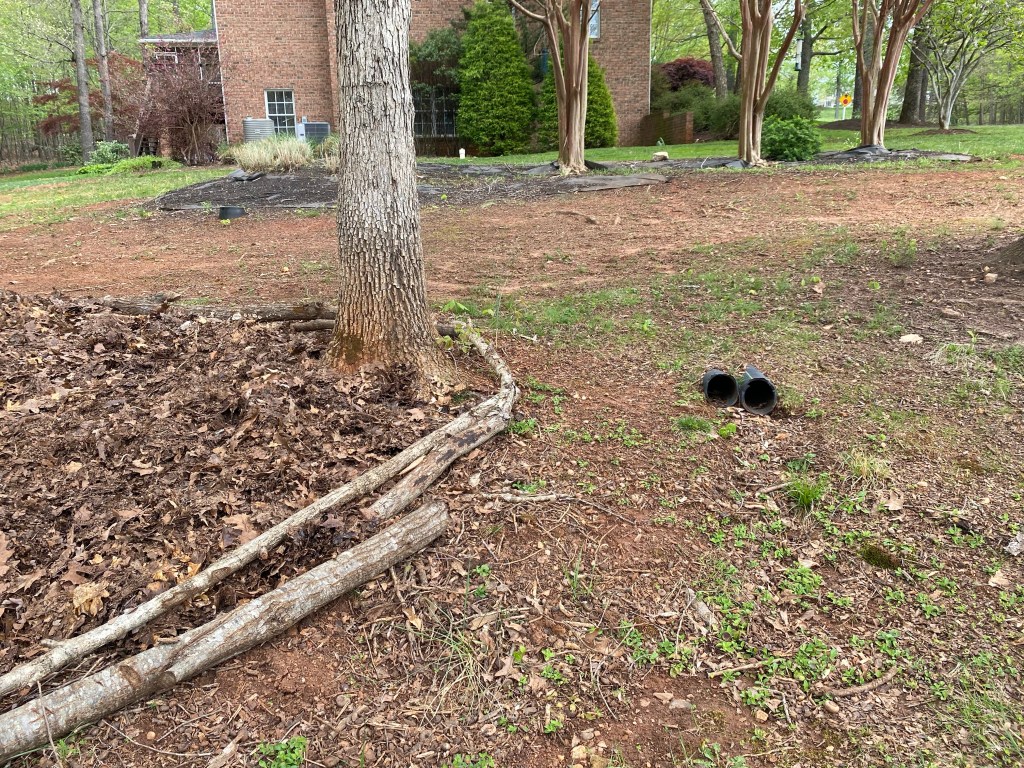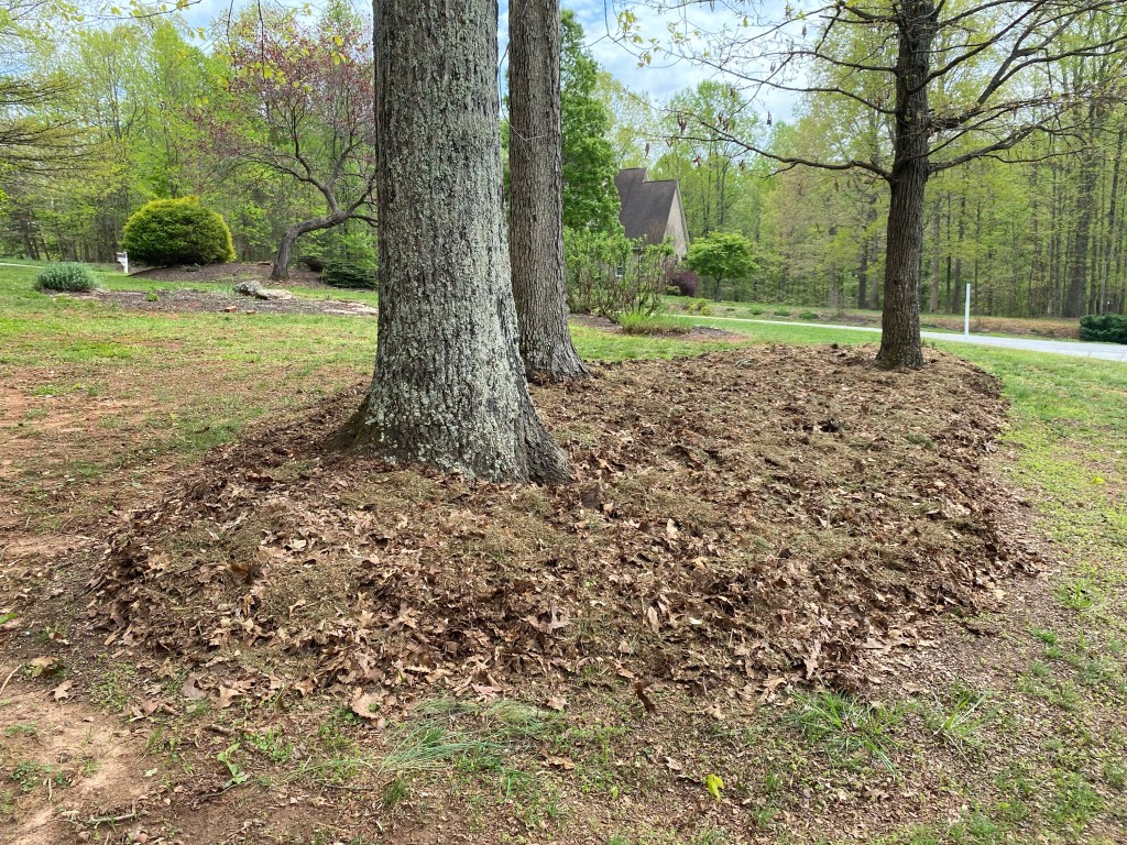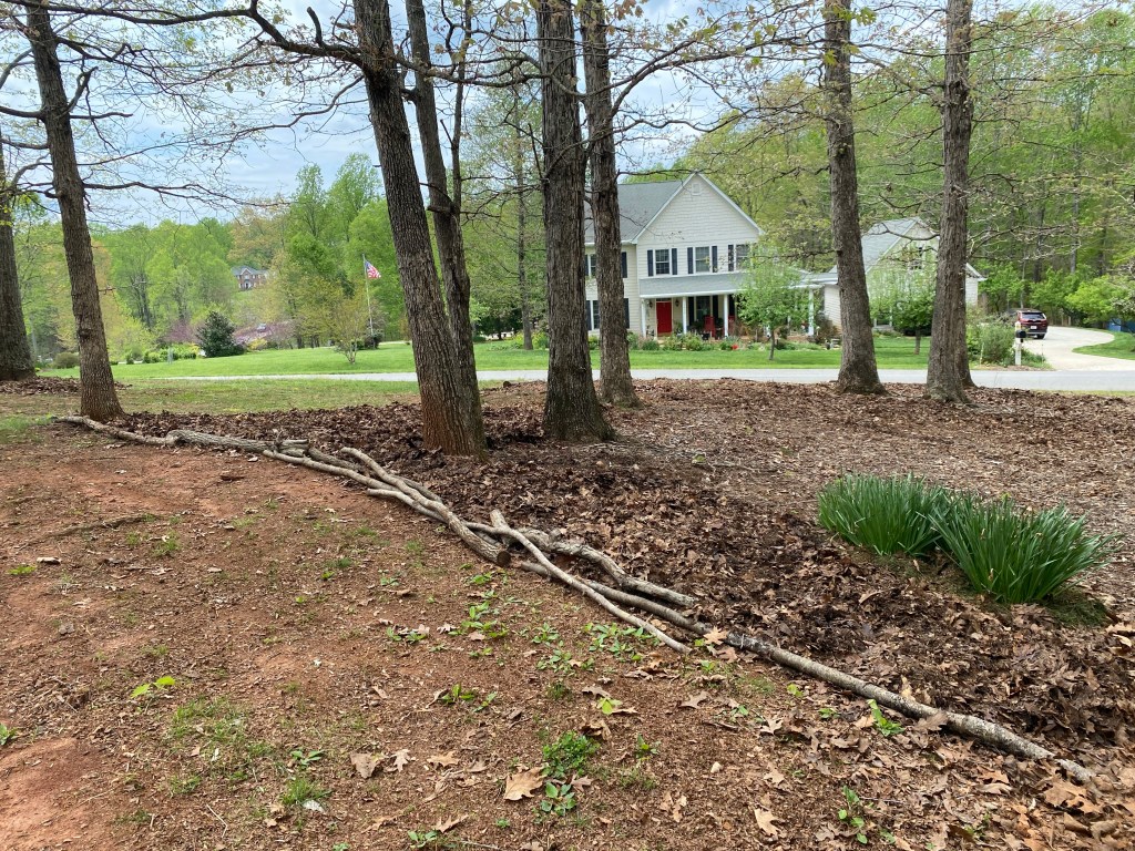 I decided to start building toward my future garden this year. I spread out the collected leaves and installed a natural barrier to help with water runoff. In a few weeks, I’ll be digging up the daffodils and spreading them around this area for a more naturalized look.