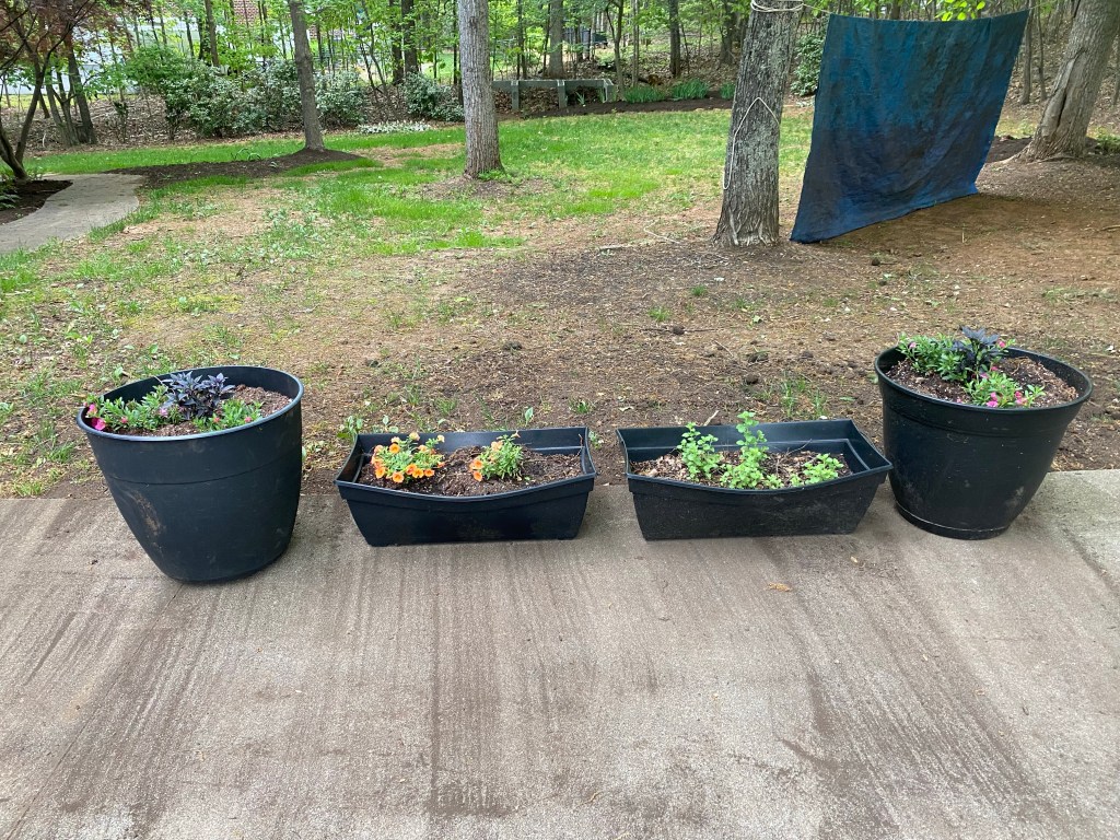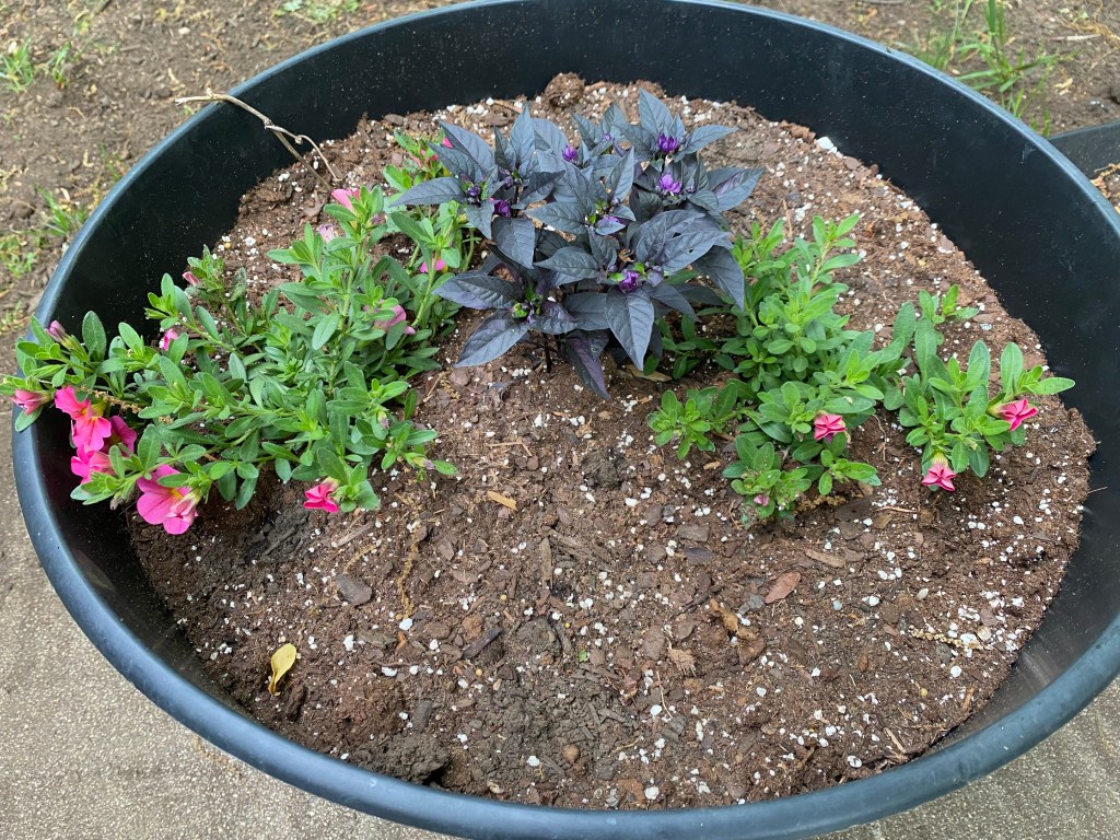 In the round pots, I have an ornamental pepper, paired with 2 petunias. I picked these petunias for their vining habit. I’m looking for an annual with white flowers and sweet potato vine, preferably green. I kept the existing soil in the pot, fluffed it and topped it off with compost and fresh soil.
