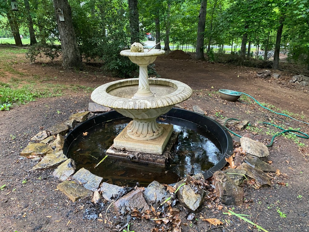 The fountain operates thanks to a switch inside the house. When we tested the pump this past weekend, water came out of the top of the fountain, though it didn’t have much force behind it. I’m hoping that cleaning out the fountain and refilling it with fresh water will improve the water flow.