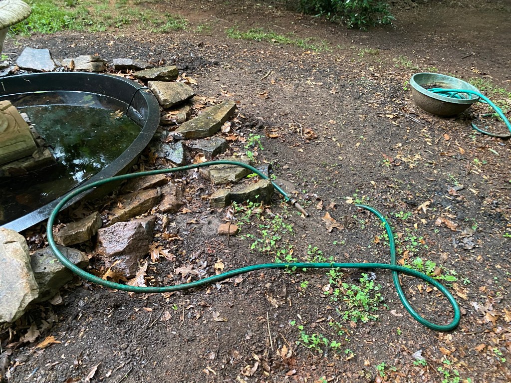 We think this hose coming out of the ground has been used to drain the bottom part of the fountain. However, it’s not working right now. I suspect the drainage hole in the fountain has become blocked over time with sediment.