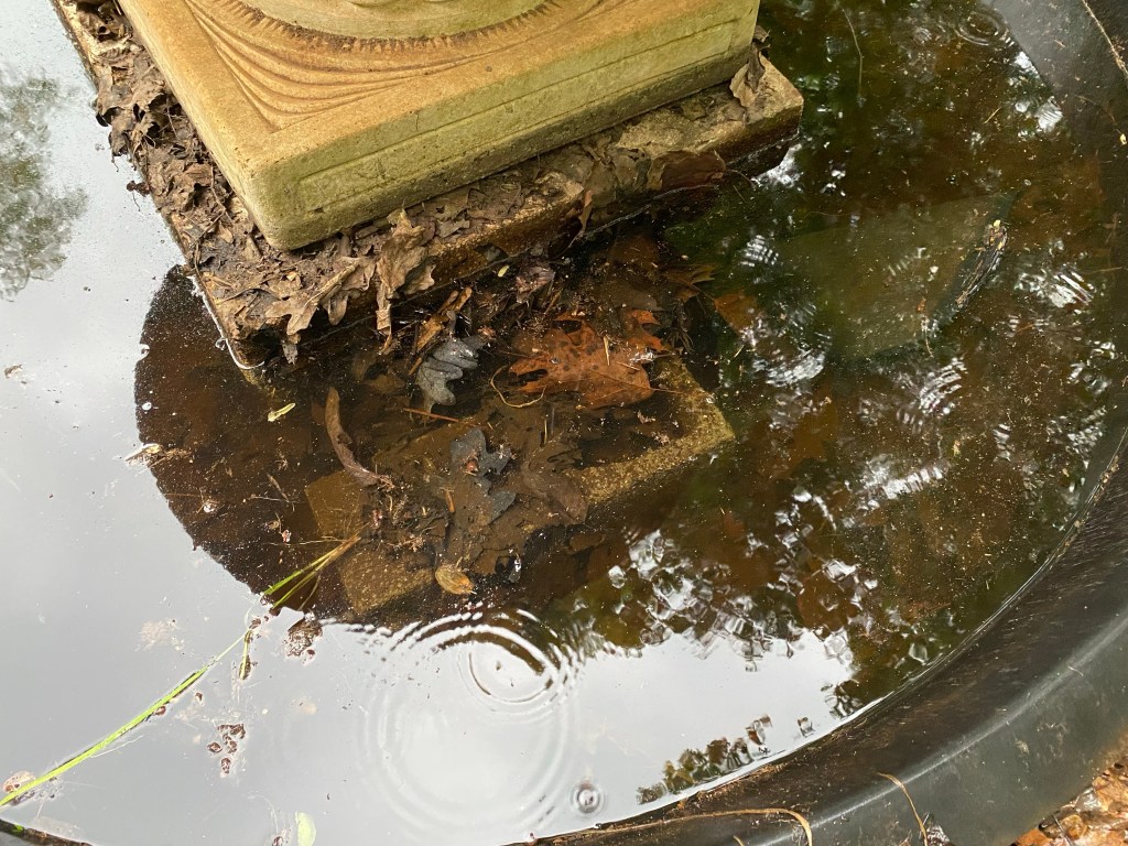 I decided to clean out the fountain this spring and see if we could get it going again. While I would not add this ornate fountain to my yard, I do like a nice water feature. And, it would take a fair amount of work to dismantle the fountain and remove it. Yes, I think it’s possible there are frog eggs in the fountain which is why we will not be using any chemicals to clean the fountain.