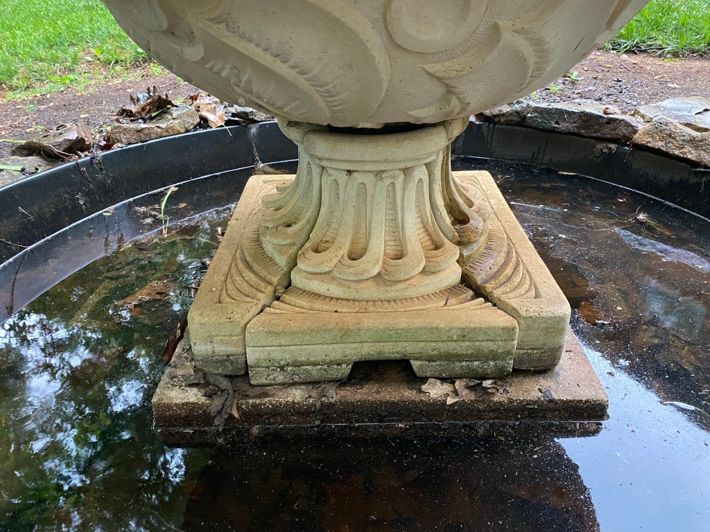 While it’s hard to see in the picture, at the top of the fountain, the water hose is visibly pointing to the right. On the left is the ornate piece that hides the hose. I found a few brass options on Amazon to replace the ornate piece which is currently broken. It’s been repaired in the past, though the repair may not have been enough.