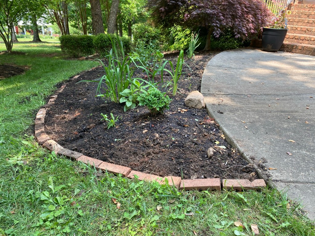 I added the dirt and grass I removed from the front to the bed I’m building downhill from the driveway. We were unsuccessful in growing grass in this area last year. The area remains shaded most of the day, and the soil is Virginia red clay. My plan is to let the clumps break down over the year to build up the soil underneath. If the grass in the clumps sprouts, I’ll pull it and add it to my compost bin.