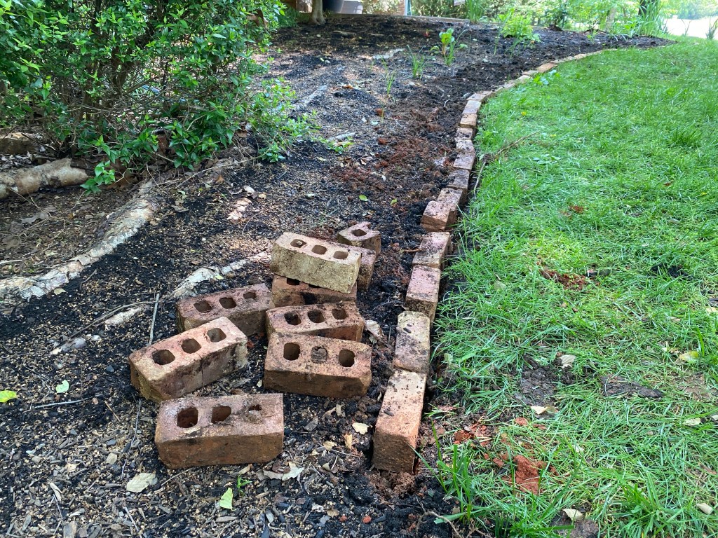 To save money, I’m using bricks I found in our yard. Some were dumped by the driveway and covered by dirt. Others were dumped in a huge pile in the gully behind our home.