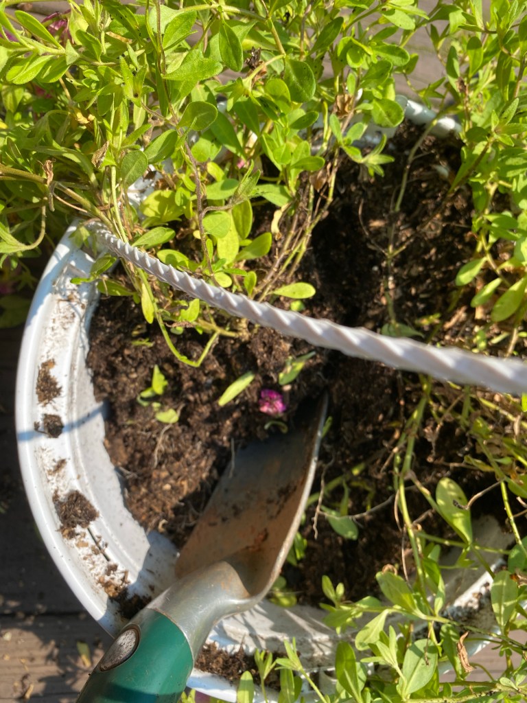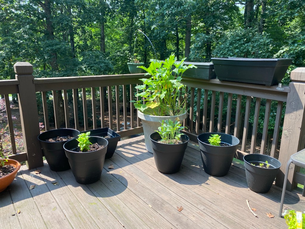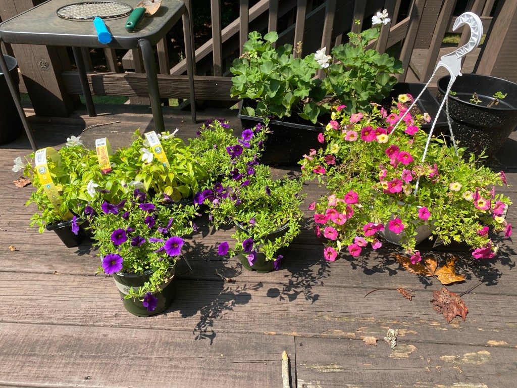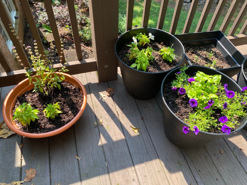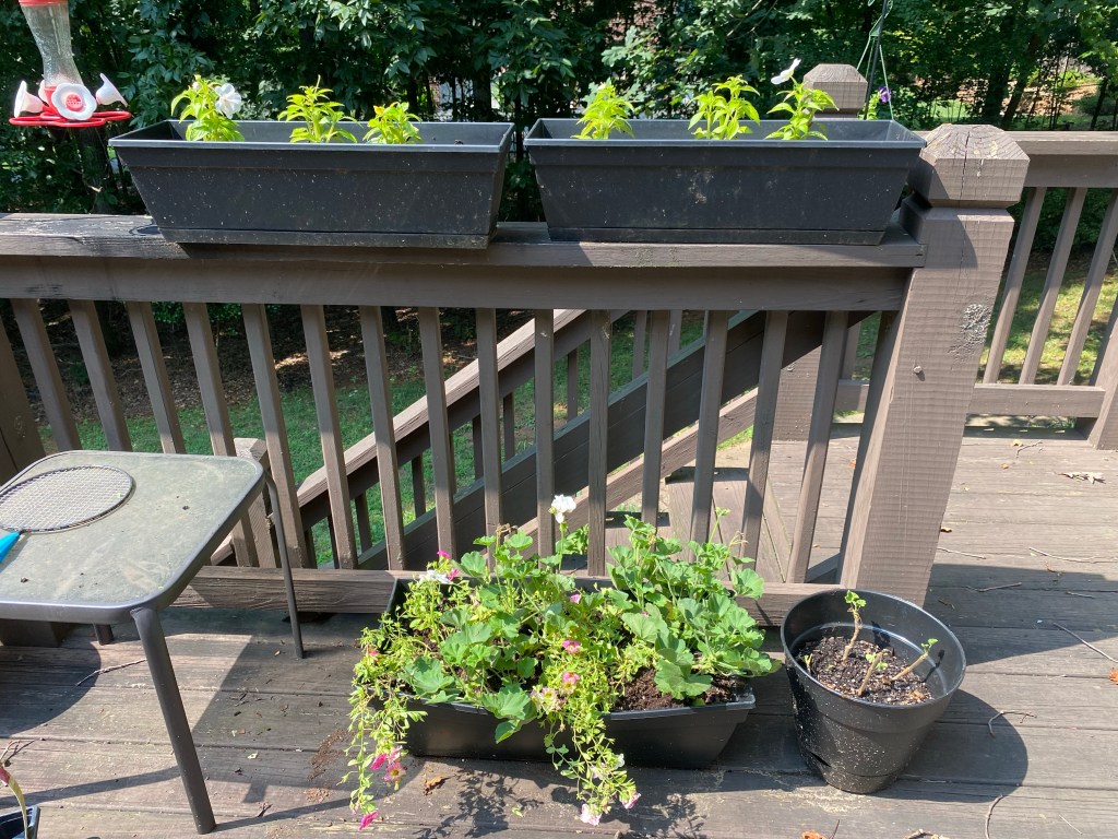 With the lettuce bolting in my back porch pots, I decided to switch them over to pots of annuals. I haven’t had much luck growing plants from seed in these pots. I suspect the porch doesn’t get enough light.