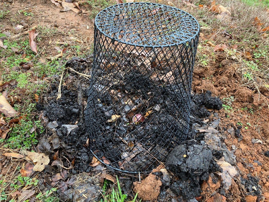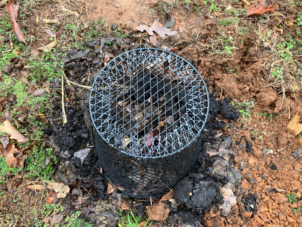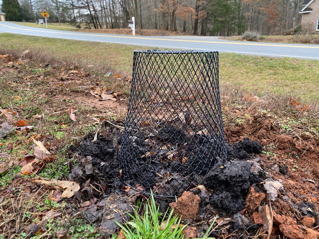 This is a wire trash can from the Dollar Tree. It cost me $1.25. The package of landscape staples I picked up from Walmart was probably about $5. The trash can came in black and white. I chose black for the less obtrusive profile.