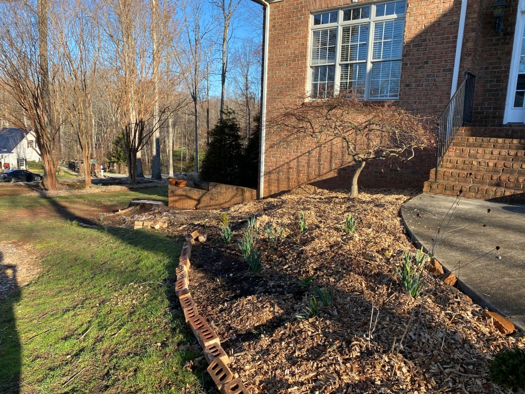 While I appreciate the free wood chips, I realized this spring that I preferred the darker look of shredded mulch and leaf mulch. I think the spring bulbs are blending into the woodchips.