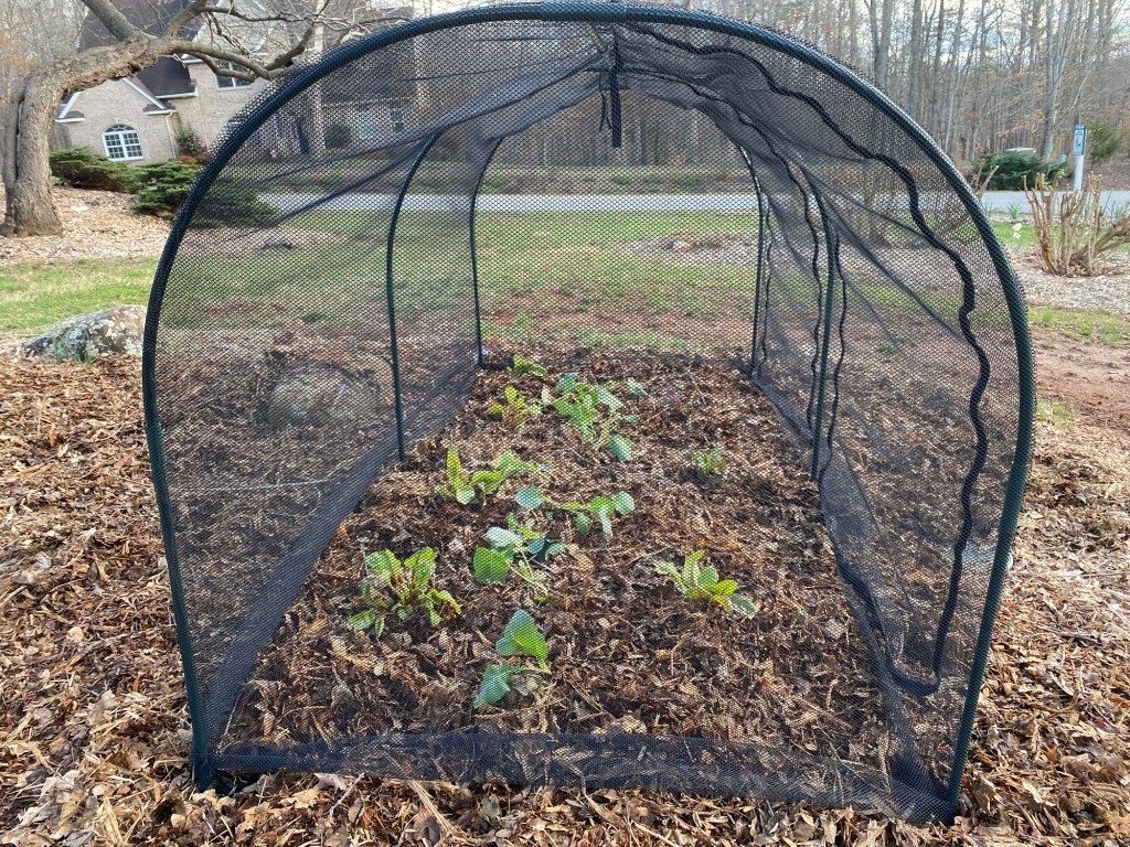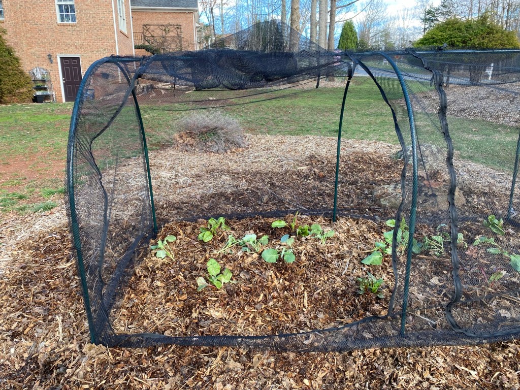 As you can see, there are 2 zippered openings on the crop cage. I planted broccoli and Swiss chard. As I’m looking at this picture, I realize it will be somewhat difficult to access the plants in the back without stepping inside the cage. When I do the next crop cage, I think I’ll organize the plants a little differently.