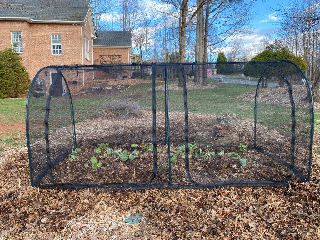 In my search for ways to have a vegetable garden while living with deer, I came across this 8 x 4 foot crop cage on Amazon for $72.99. I bought 3 to install them in a bed that I wasn’t ready to work on this year.