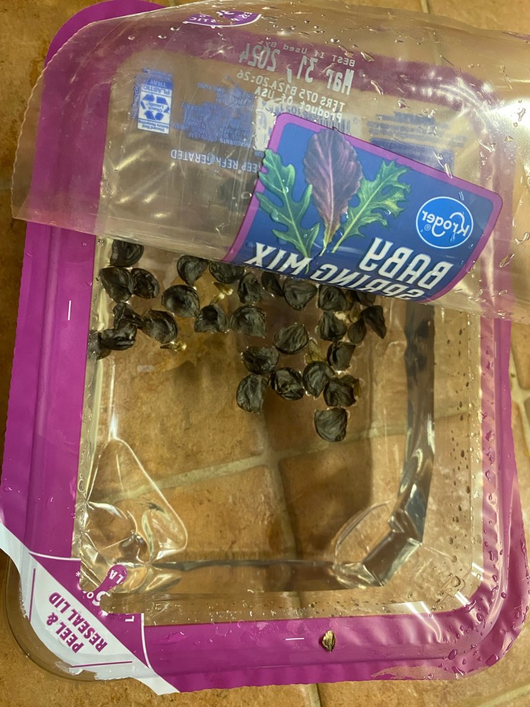 This is my setup for floating seeds. I recycled a lettuce container that has a peel-off lid. I’m keeping these in my indoor greenhouse which is around 70 degrees with the lights. Once these sprout, I’ll set them up, probably in the breakfast room. I have a feeling I’m going to need grow lights to encourage the amaryllis to grow. According to my research, it takes about 4 to 5 years for the amaryllis to grow large enough to flower.