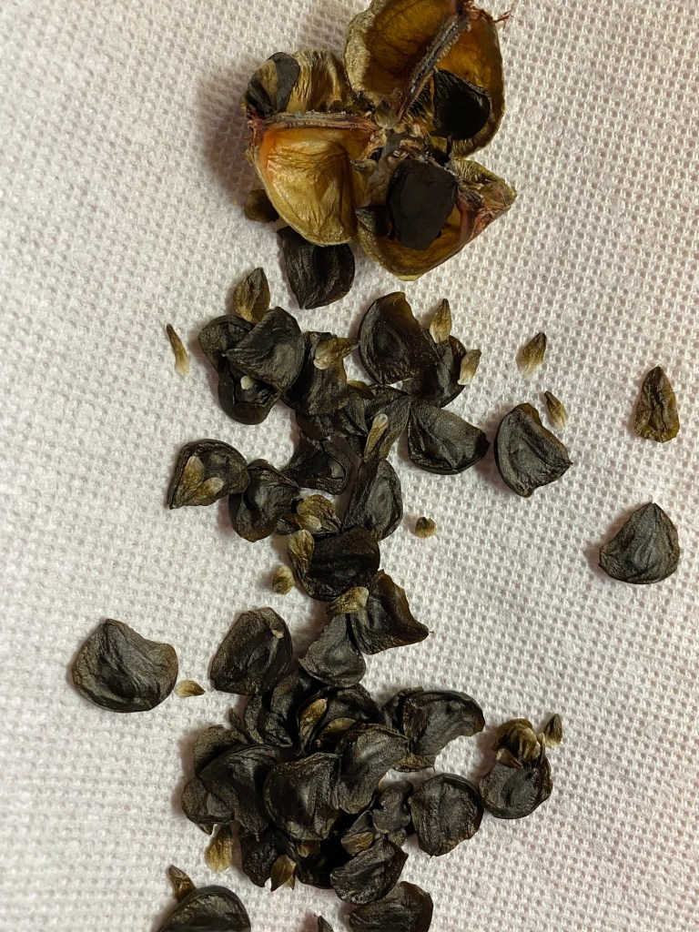 I waited for the bulbs to completely dry and begin to open. Inside were these brown/black papery thin seeds.
