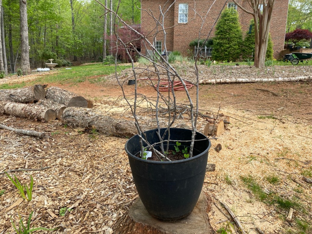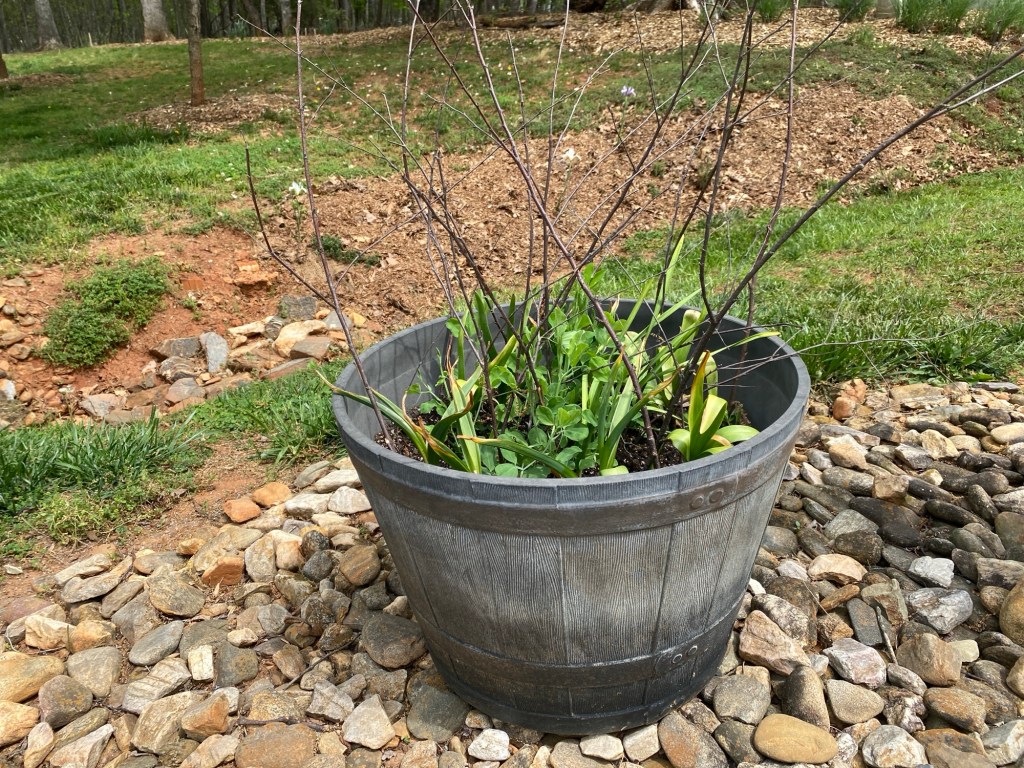 I don’t have the right trees for coppicing, however, I have lots of trees and woody shrubs. I grabbed branches about an inch in diameter and stuck them into the pots. Since the river birch tends to shed branches like nothing else, I jammed more of those into the pot. Since I wasn’t sure how heavy the sweet pea vines would be, I wanted to be sure they had plenty of support. I can always add more branches later if needed.
