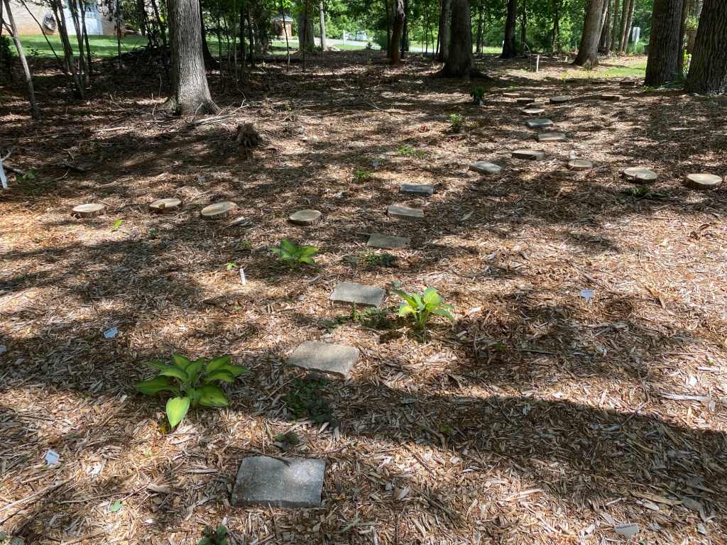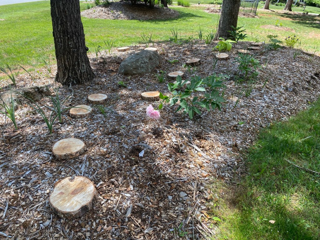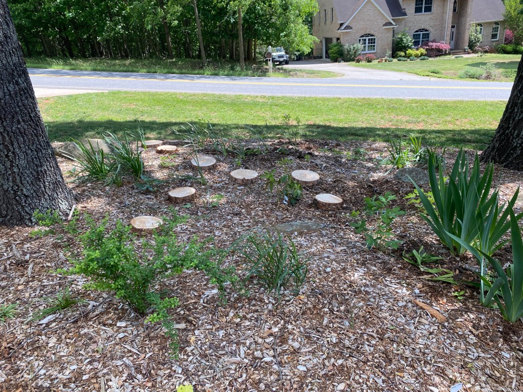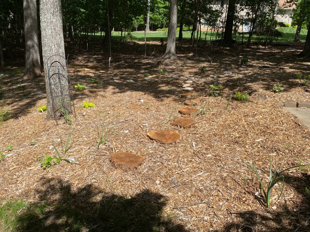 Then, I realized I could use the logs we had saved as stepping stones. While river birch is not the ideal tree for this purpose, it’s what I had. I wish I had asked to keep the 2 oak trees we had removed. Oak should last much longer, perhaps up to 10 years.