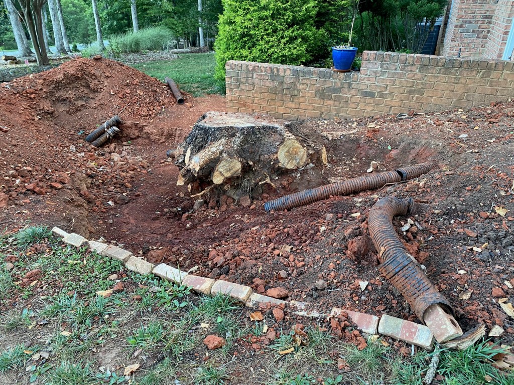 The river birch stump is out! It took my husband several months with the help of two of my sons to dig out the stump, fix the underground drainage pipes and grade the area. The roots were tough to dig up. Several wrapped around the brick wall and went under the patio on the other side.
