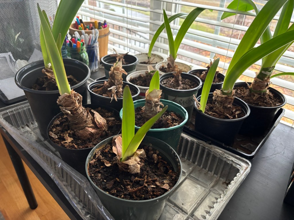They are growing now. Since we keep the door closed, the office tends to be a bit warmer. The main window is south-facing. We’ll see if these bulbs bloom. I’m debating putting them outside in a sunny area of the yard this spring. According to Gardening Know How, the bulbs can grow outside up to zone 7b which is our zone here in Southwest Virginia. However, I wouldn’t let them overwinter.