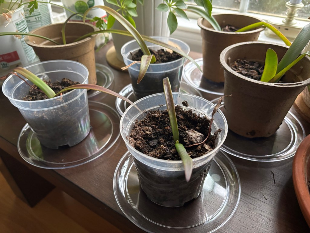 The other part of my collection is bulbs I grew from seed. Last winter when my new amaryllis bulbs bloomed I used a paintbrush to pollinate them. After the blooms died back, I had many papery black seeds. I floated them in water to start new bulbs and transplanted the new ones into pots when a root appeared. These bulbs will take several years to grow big enough to produce a flower.