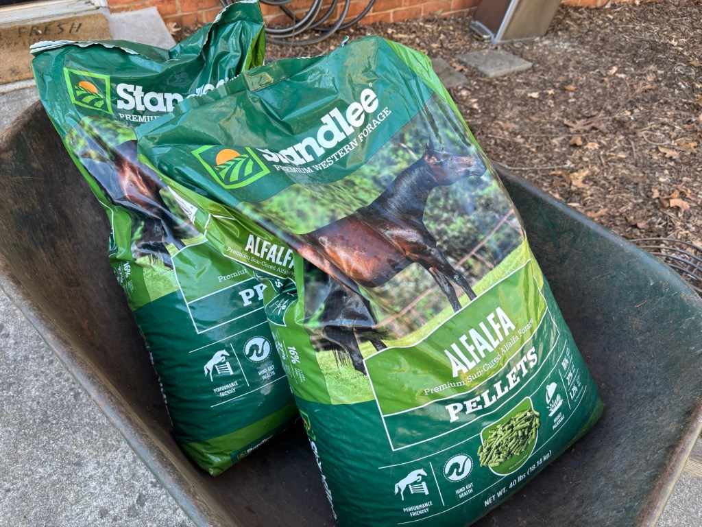 This week I’m adding more alfalfa pellets to our flower beds. This brand (40 lb. bag) has been on sale at Tractor Supply for $17.99. So far, I’ve purchased 8 bags though I could use an additional 8.