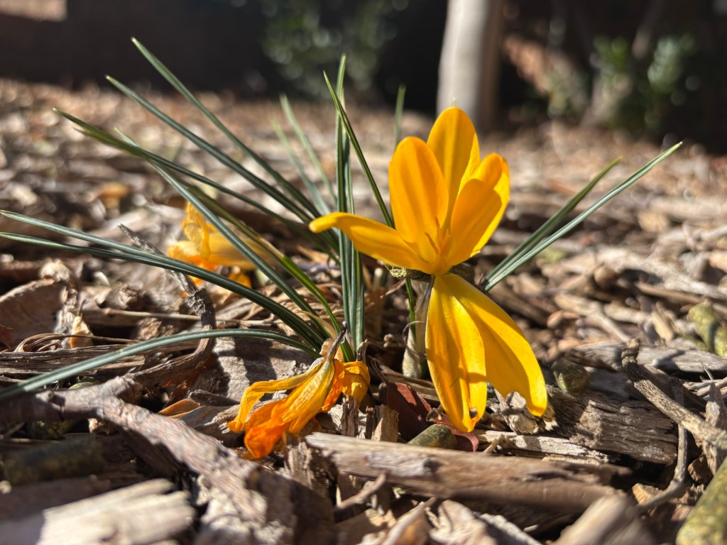 As I work in the beds this week, I’m seeing signs of new life. These crocus are coming up in the bed near our front steps. I can’t wait to see the daffodils come up; they’re my favorite early spring flower!