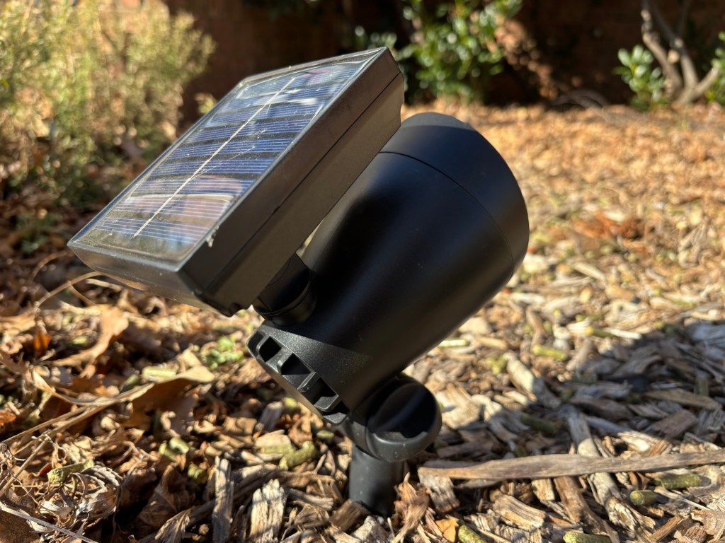 I bought this type of light in December for our Christmas lighting. It’s worked fairly well illuminating the front of the house, though I may need to move them once the leaves appear on the trees. For now, they get just enough light on a sunny day to spotlight our home. I found them at Home Depot for about $10 to $12.