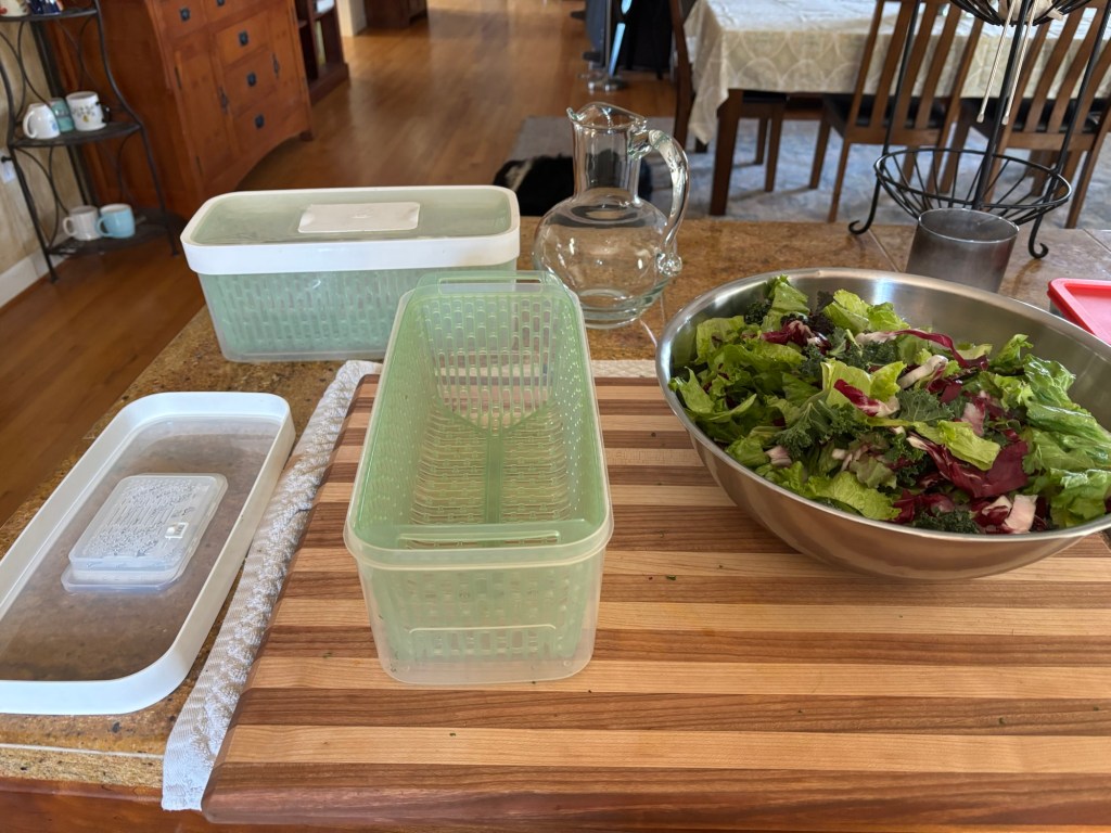 I’m storing my salad greens in an Oxo produce keeper I bought on Amazon over 5 years ago. I probably need to buy a new filter since it’s supposed to be replaced every 3 months, however, I’ve never replaced mine. I haven’t noticed a difference. The carbon filter captures ethylene gas to help produce stay fresh longer. For our purposes, we haven’t had issues with produce going bad quickly.